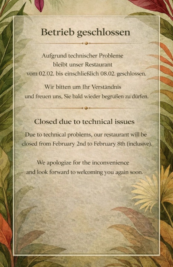 Geöffnet von Sonntag bis Donnerstag von 11:00 Uhr - 22:00 Uhr